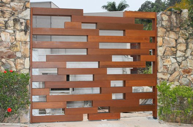 Aplicação como revestimento de forro e de parede, e como porta e portão. As portas em Aço Cortén Coppermax aceitam diversos tipos de fechaduras.