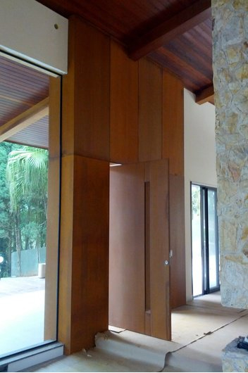 Aplicação como porta pivotante interna e bandeira fixa. As portas em Aço Cortén Coppermax aceitam diversos tipos de fechaduras.